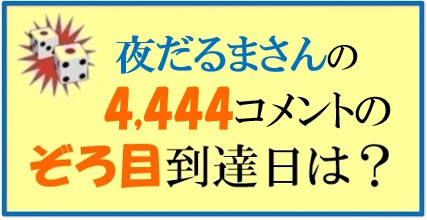 夜だるまさんの4,444コメントのぞろ目到達クイズを行います。下記の1月10日から16日までの到達候補日から選んで回答して下さい。到達候補日の範囲は夜だるまさんが決めました。的中したら年間ポイント3点を獲得です。