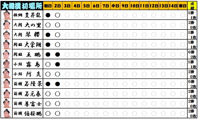 大相撲春場所2日目の結果はご覧の通りです。