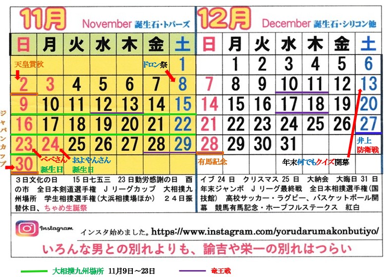 12月は竜王戦が決着していなければ10・11日に第6局、17・18日に第7局ですがおそらく無いでしょう(笑) 13日から年末何でもクイズを予定しています。27日に「モンスター」井上尚弥の防衛戦、28日が今年ラストのイベント有馬記念です。この日までには令和7年度の年間王者は決まっているのでは?